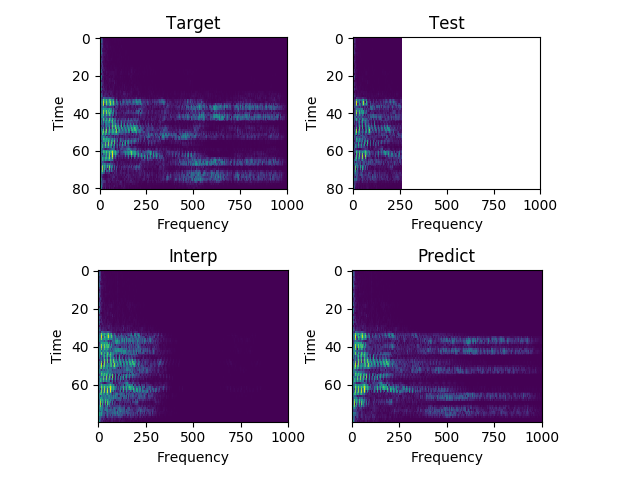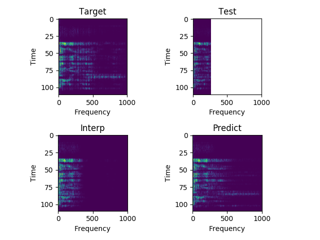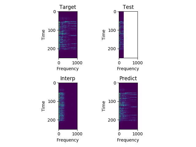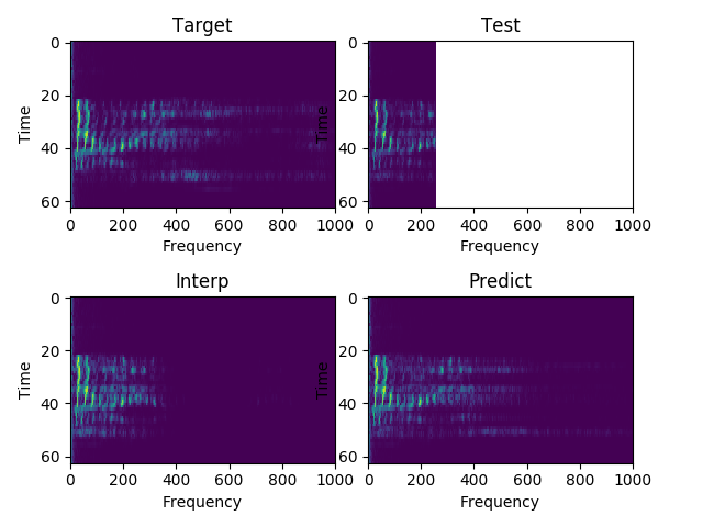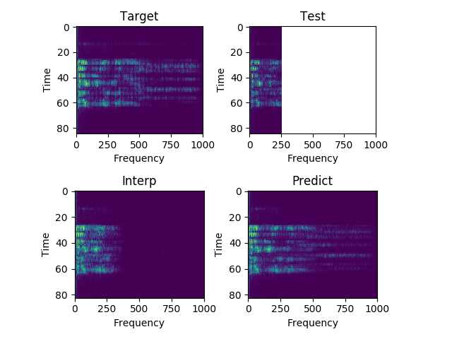 Each sample consists of the target (HD audio ground truth), the estimate (low-quality audio), and the prediction (HD audio NN recreation) respectfully. Also, each sample is paired with their respective spectrograms for visualization purposes.